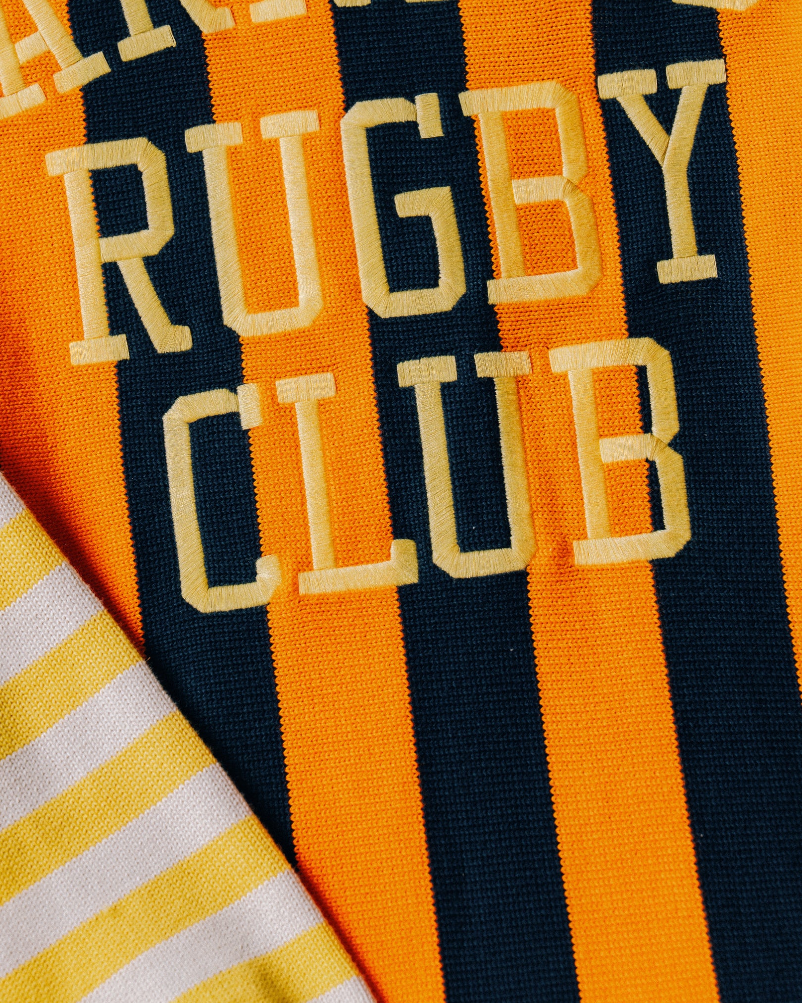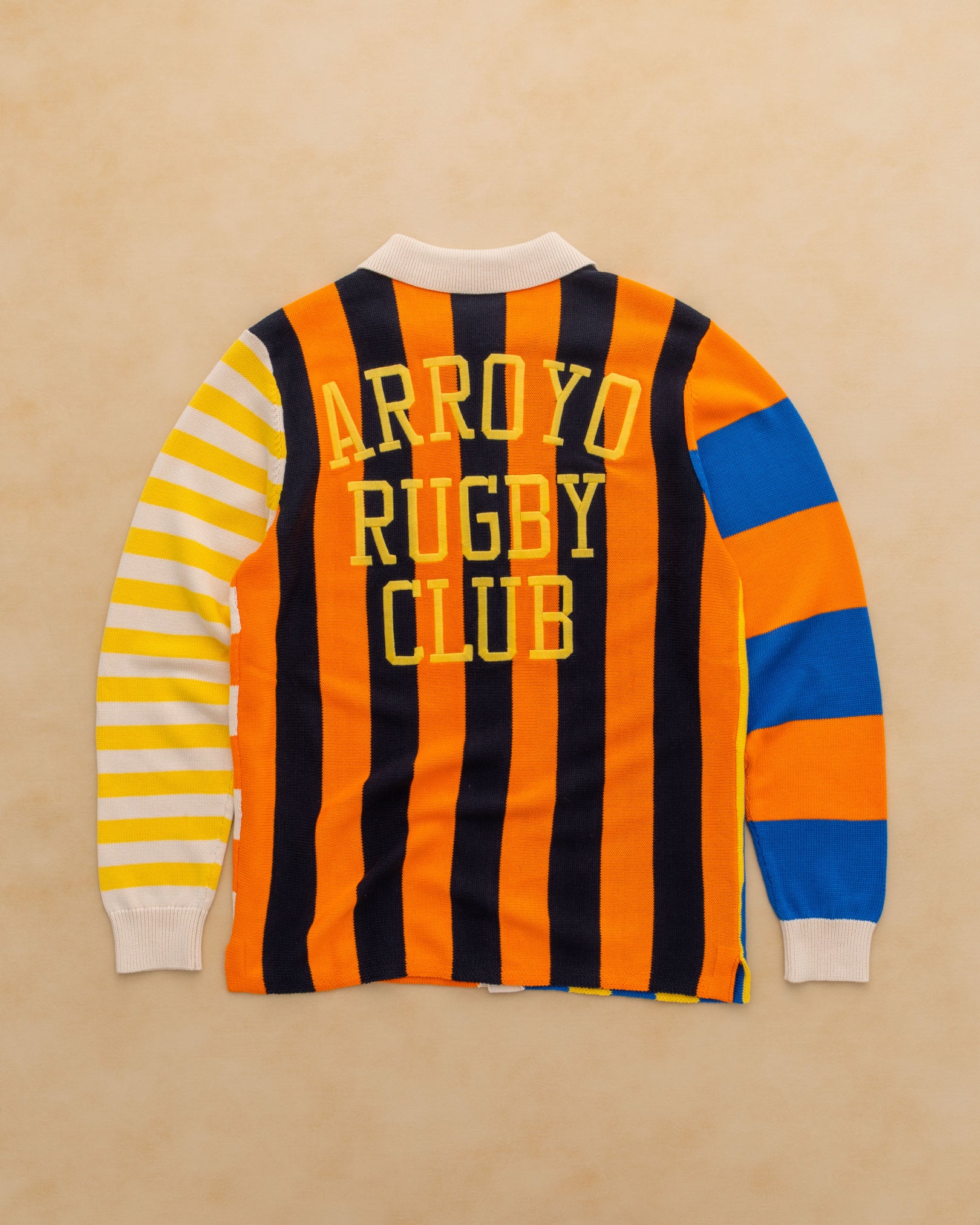 Crafted in a 7-gauge jersey knit, this button down features a patchwork of striped patterns across each panel—bringing rhythm and movement to a timeless silhouette. An embroidered fringe Messenger patch accents the left chest, while a large satin-stitch motif anchors the back.