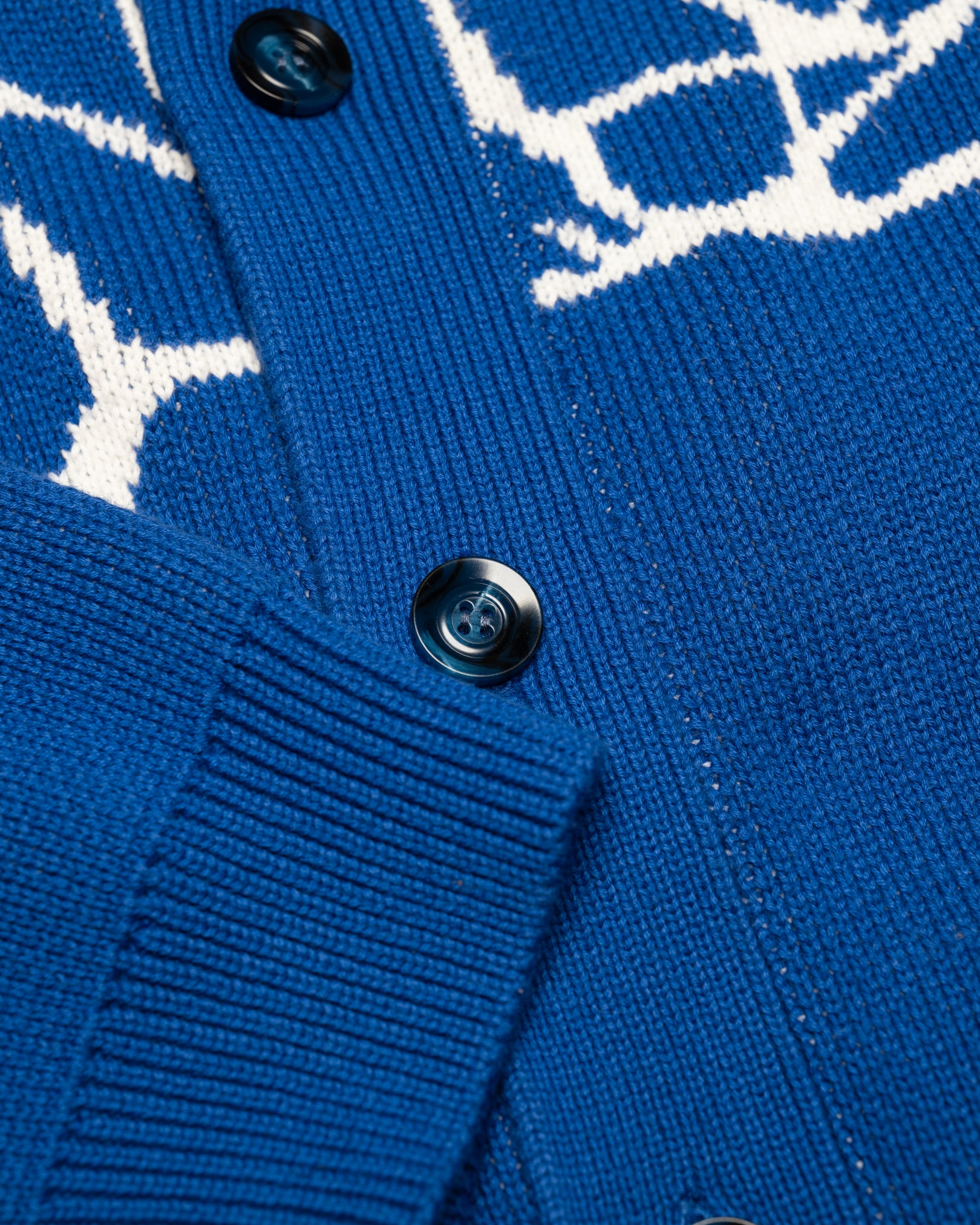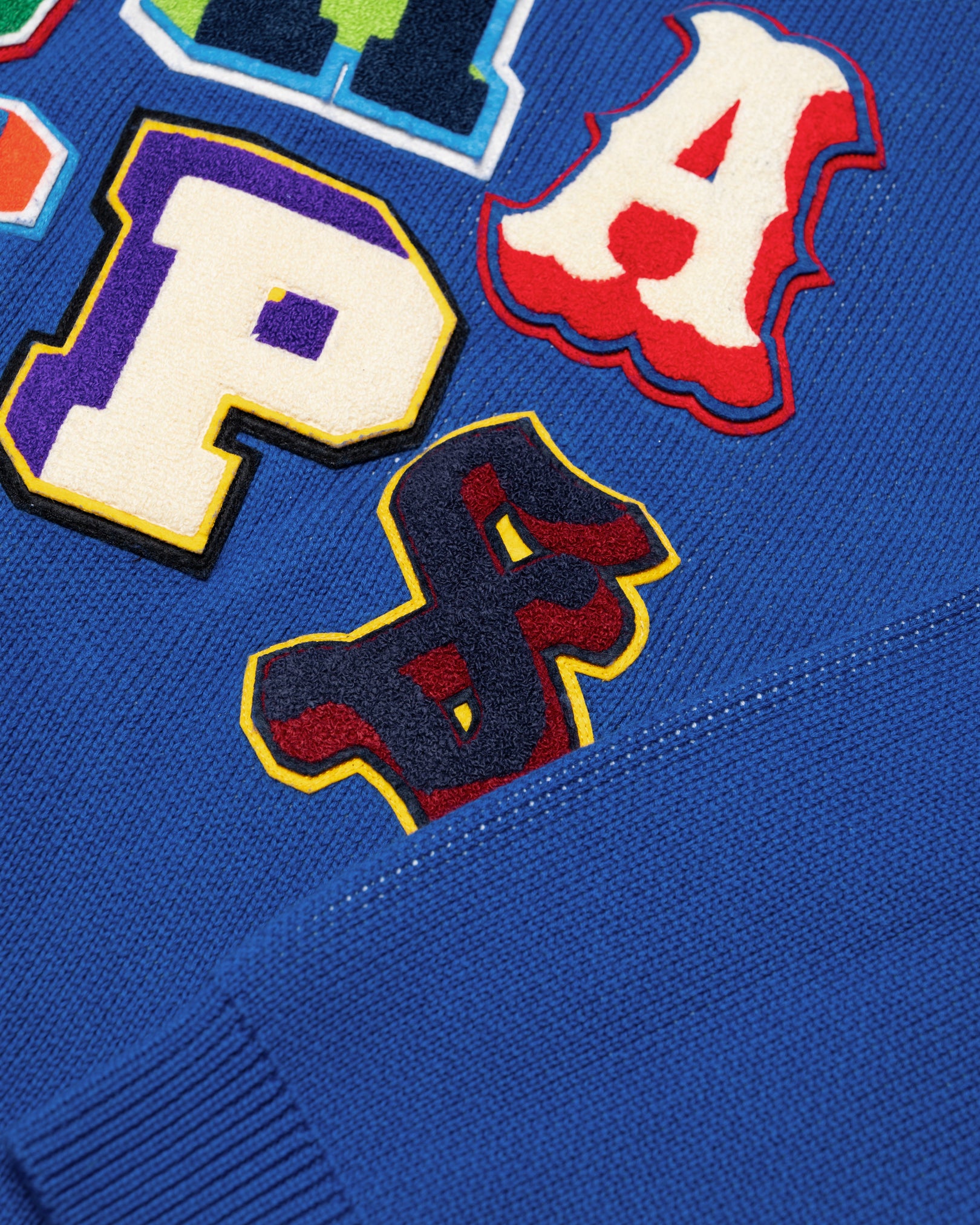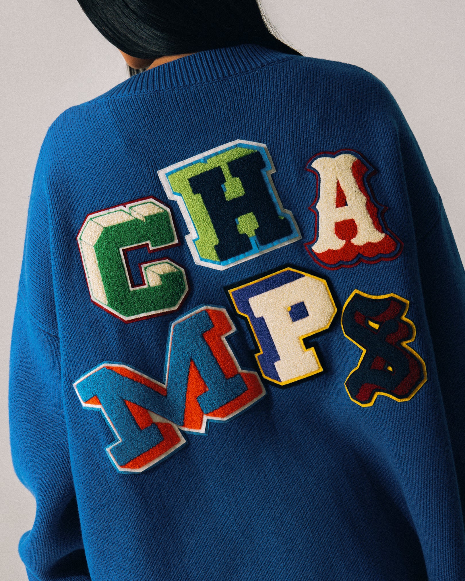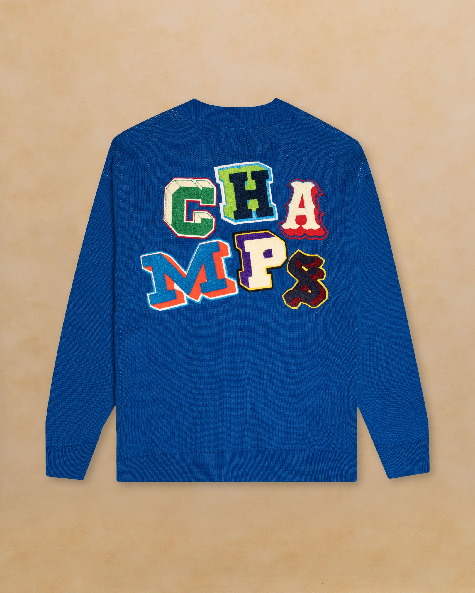 Knit in a 5-gauge jacquard jersey, it features an oversized basketball net graphic across the front and body, while the back is covered in ransom-style chenille patches reading “CHAMPS.” Finished with elevated detailing that blends heritage sport with modern craftsmanship.