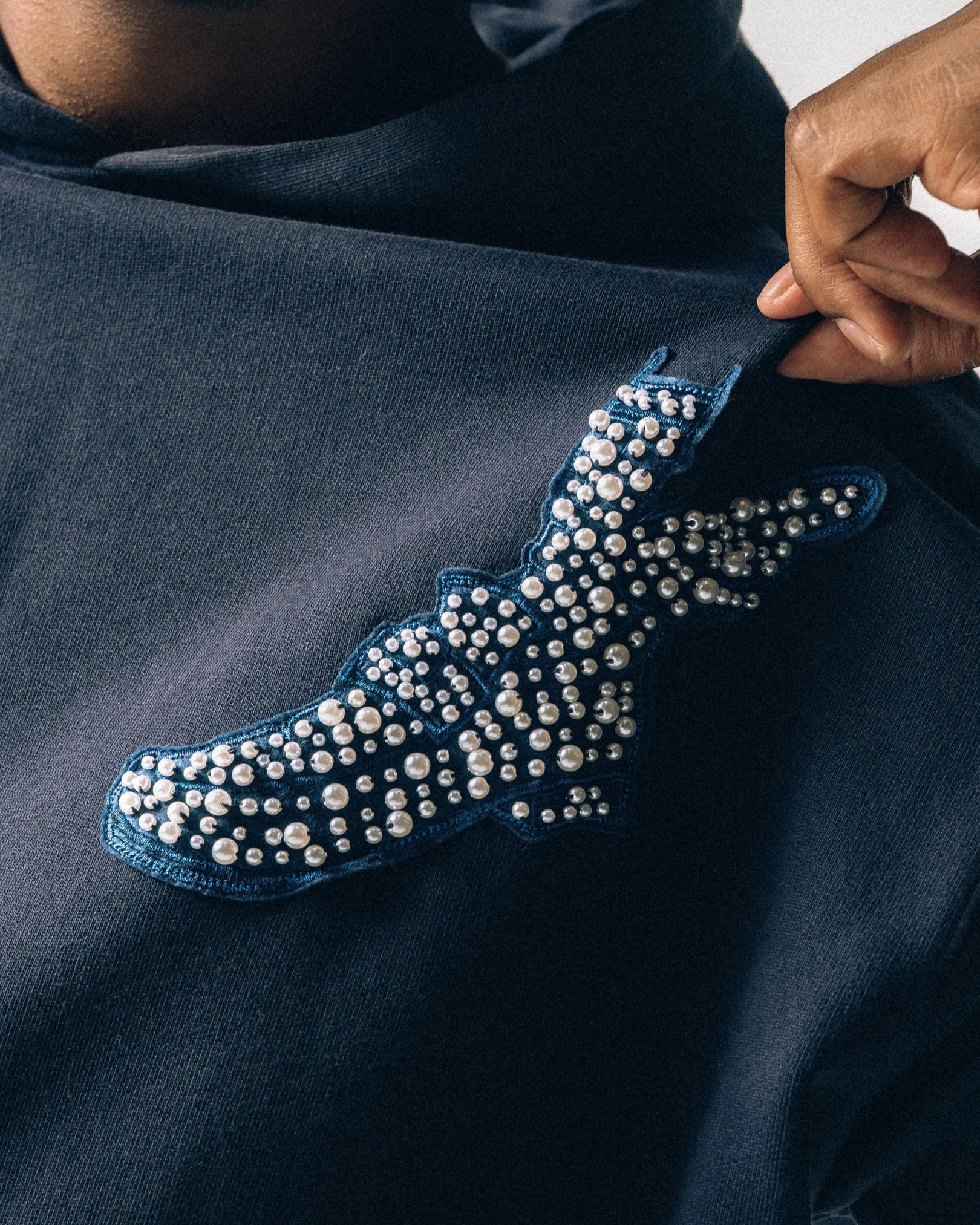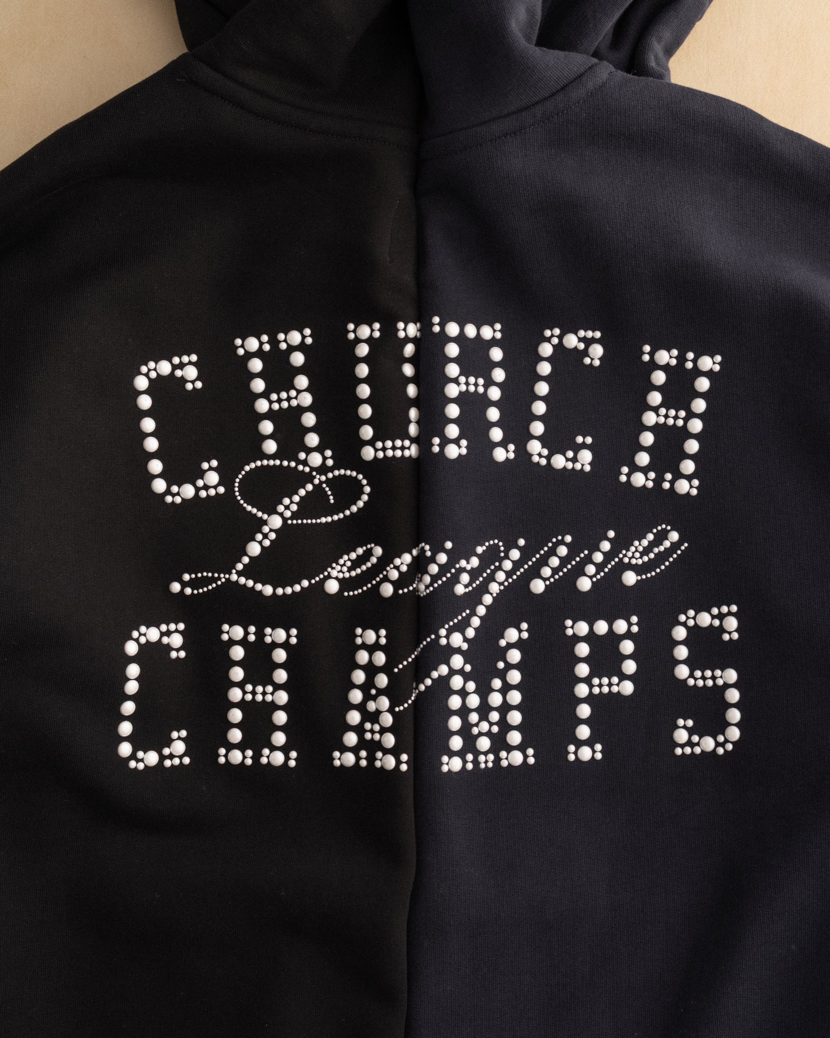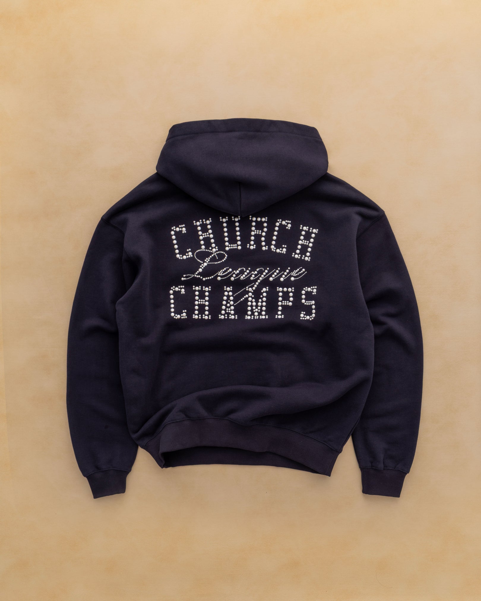 Crafted from heavyweight 14.7 oz French terry, this oversized hoody commands presence with softness and structure. Pearl appliqué detailing nods to the grace and quiet power of the church—the ones who show up draped in elegance, legacy, and undeniable style. A tribute to tradition, reimagined for today.