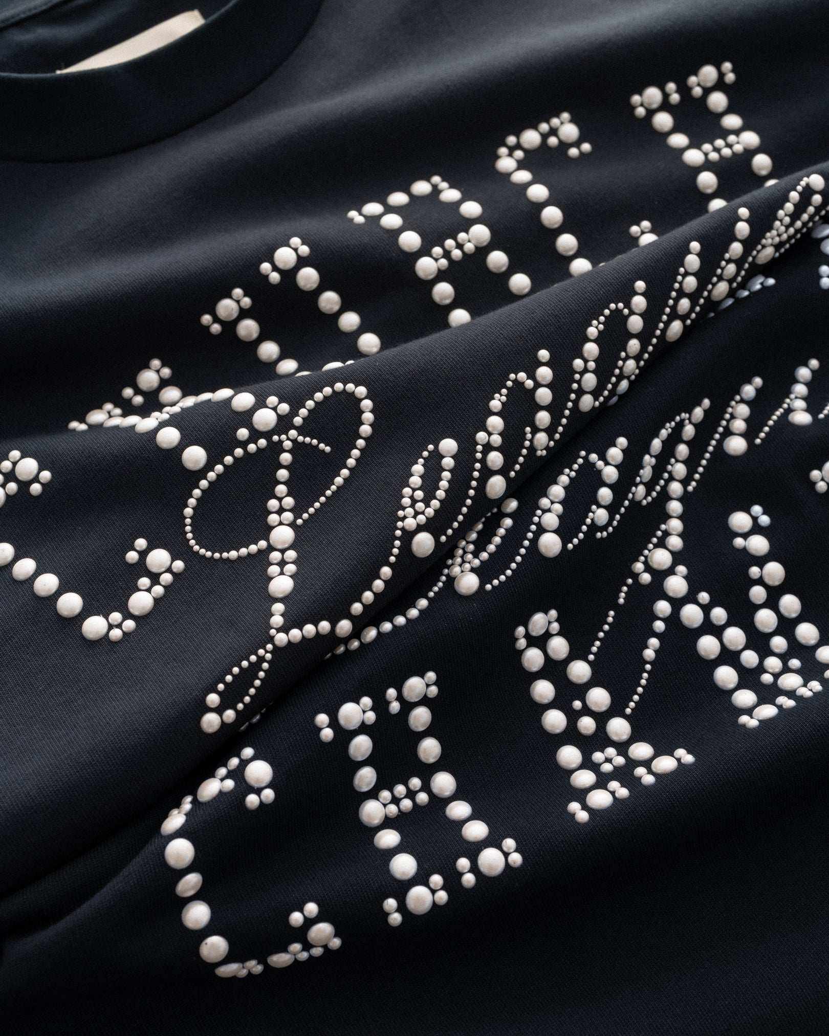 Crafted from heavyweight 9oz organic cotton, this tee delivers a buttery-soft feel with a structured, elevated drape. Pearl appliqué at the chest nods to the quiet power and grace of the church— echoes of tradition worn with pride. Finished with our signature Messenger patch at the back hem